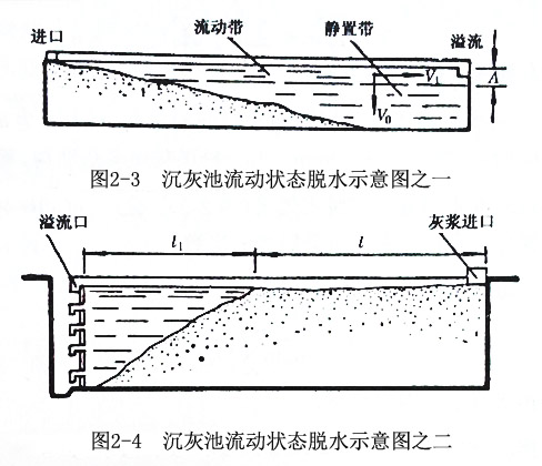 灰水流動狀態(tài)的脫水是灰水由沉灰池的一端進入,澄清水由另一端溢流排出的連續(xù)作業(yè),灰粒在灰水流中邊流動邊沉降。在沉灰池中灰水分為兩帶,上層灰水流動部分稱為流動帶,下層靜止沉降積灰部分稱為靜置帶(圖2-3和圖2-4)。沉灰池中粗、重顆粒,由于水力沉速快,穿過運動帶的時間很短,被灰水流攜帶向溢流口移動的距離也很短,故在沉灰池進口處快速沉降,而形成一個坡向溢流口的斜面。灰水不斷引進,澄清水溢流,斜面積灰層逐漸增高,待溢流水中含灰量超過允許限度(<0.1)時就關閉灰水進口閘門,再靜置一段時間后,入出澄清水就可以挖灰使用。