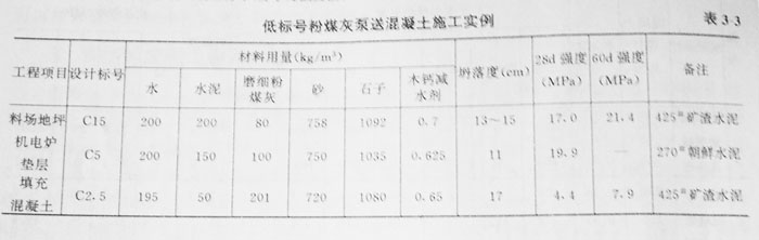 可泵性主要決定于混凝土與管壁之間的摩擦力。由于低標(biāo)號混凝土的水泥用量少,可泵性差,因此,過去規(guī)定C15以下的混凝土不得泵送??墒菗饺绶勖夯液蜏p水機(jī)劑后,可使混凝土在不增加水泥的情況下仍能獲得良好的可泵性。在寶電工程中,C2.5、C5和C15的混凝土在300m水平硬管輸送時(shí)也沒有發(fā)生堵塞現(xiàn)在。表3—3是低標(biāo)號粉煤灰泵送混凝土的施工實(shí)例。